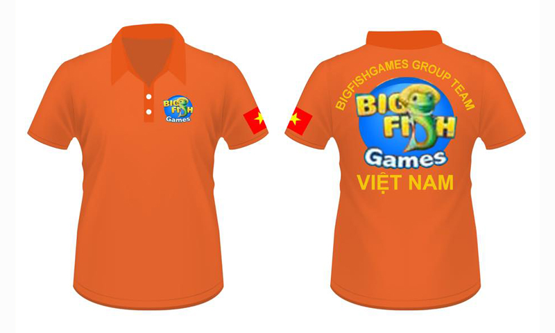 - Áo thun đồng phục của công ty Big Fish được thiết kế với tông màu cam chủ đạo, rất nổi bật.