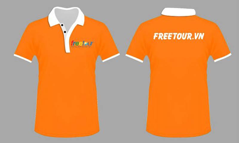 - Mẫu áo đồng phục công ty Freetour được thiết kế với gam màu cam tươi nổi bật, logo, tên doanh nghiệp và viền tay áo màu trắng, tạo nên một cảm nhận tràn đầy năng lượng.