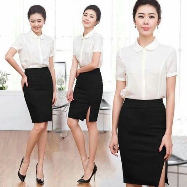 Đến ngân hàng hay các văn phòng khác, váy đồng phục công sở xẻ trước rất dễ bắt gặp. Mẫu váy này vẫn có độ dài phù hợp, đảm bảo được độ kín đáo. Phần xẻ trước giúp người mặc trông trở nên cao ráo hơn rất nhiều.