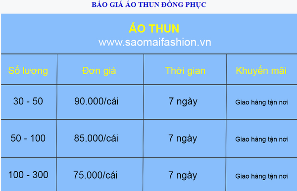 Sao Mai là một trong những đơn vị hàng đầu trên thị trường chuyên cung cấp các loại áo thun đồng phục. Chính vì vậy, mà chúng tôi có rất nhiều mẫu áo thun như: áo thun đồng phục cổ tròn, áo thun đồng phục cổ bẻ, áo thun đồng phục cổ trụ, áo thun đồng phục cổ tàu, áo cổ tim...áo phối thân, phối cổ, phối tay... Để rỏ hơn, hãy liên hệ trực tiếp với Sao Mai để nhận tư vấn tốt nhất.
